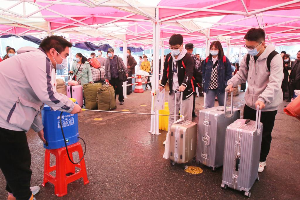 志愿者在火车站引导新生乘坐安工迎新巴士