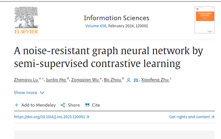 近日,我校计算机科学与信息工程学院卢政宇老师与广西多源信息挖掘与安全重点实验室、电子科技大学、杭州电子科技大学等学者团队合作,在信息科学(Information Sciences)发表了题为“A noise-resistant graph neural network by semi-supervised contrastive learning”的研究论文。