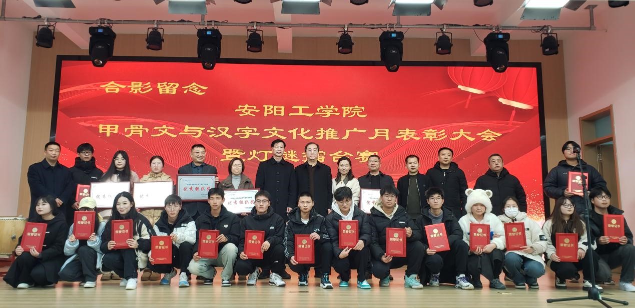 12月25日下午,我校“甲骨文与汉字文化推广月”表彰大会暨灯谜擂台赛活动在洹滨校区多功能报告厅举行。校工会主席牛瑞庆出席活动,并为优秀组织奖获得院部颁奖。部分获奖代表、相关部门领导以及师生代表200余人参加活动。汉字文化体验活动——灯谜擂台赛和颁奖活动同步穿插进行。