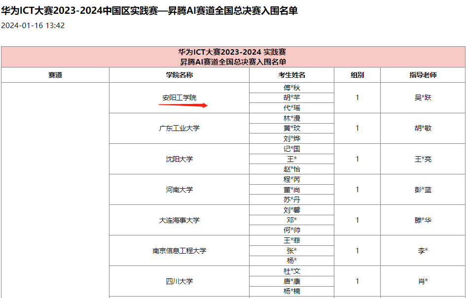 2024年1月16日,华为技术有限公司在其官网公布了“华为ICT大赛2023-2024中国区实践赛—昇腾AI赛道全国总决赛”入围名单,我校计算机科学与信息工程学院傅文秋、胡芊芊、代欣瑶同学组成的参赛队伍顺利晋级全国总决赛,实现了我校在该项赛事的新突破。