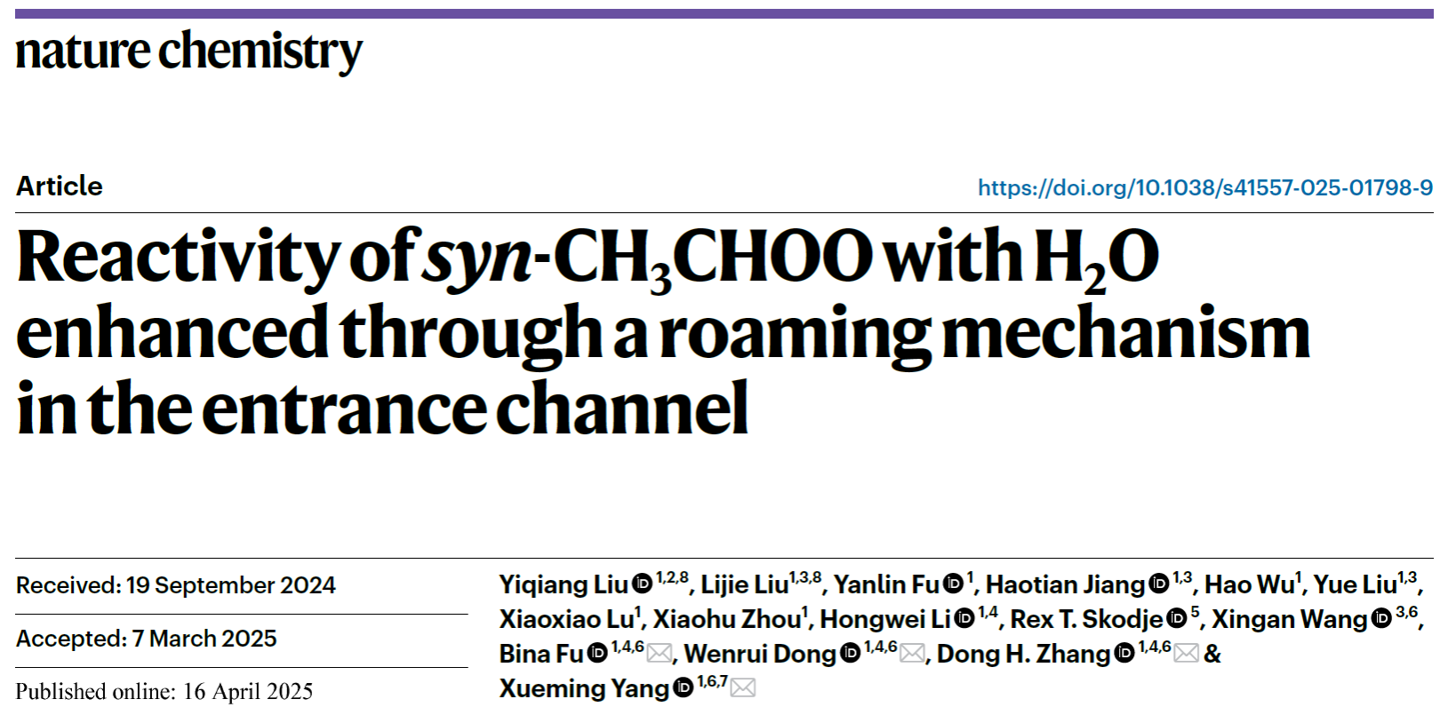 近日,我校材料科学与工程学院刘义强博士以第一作者在国际顶级学术期刊《Nature Chemistry》(IF=19.2)在线发表了题为“Reactivity of syn-CH3CHOO with H2O enhanced through a roaming mechanism in the entrance channel”的研究论文。