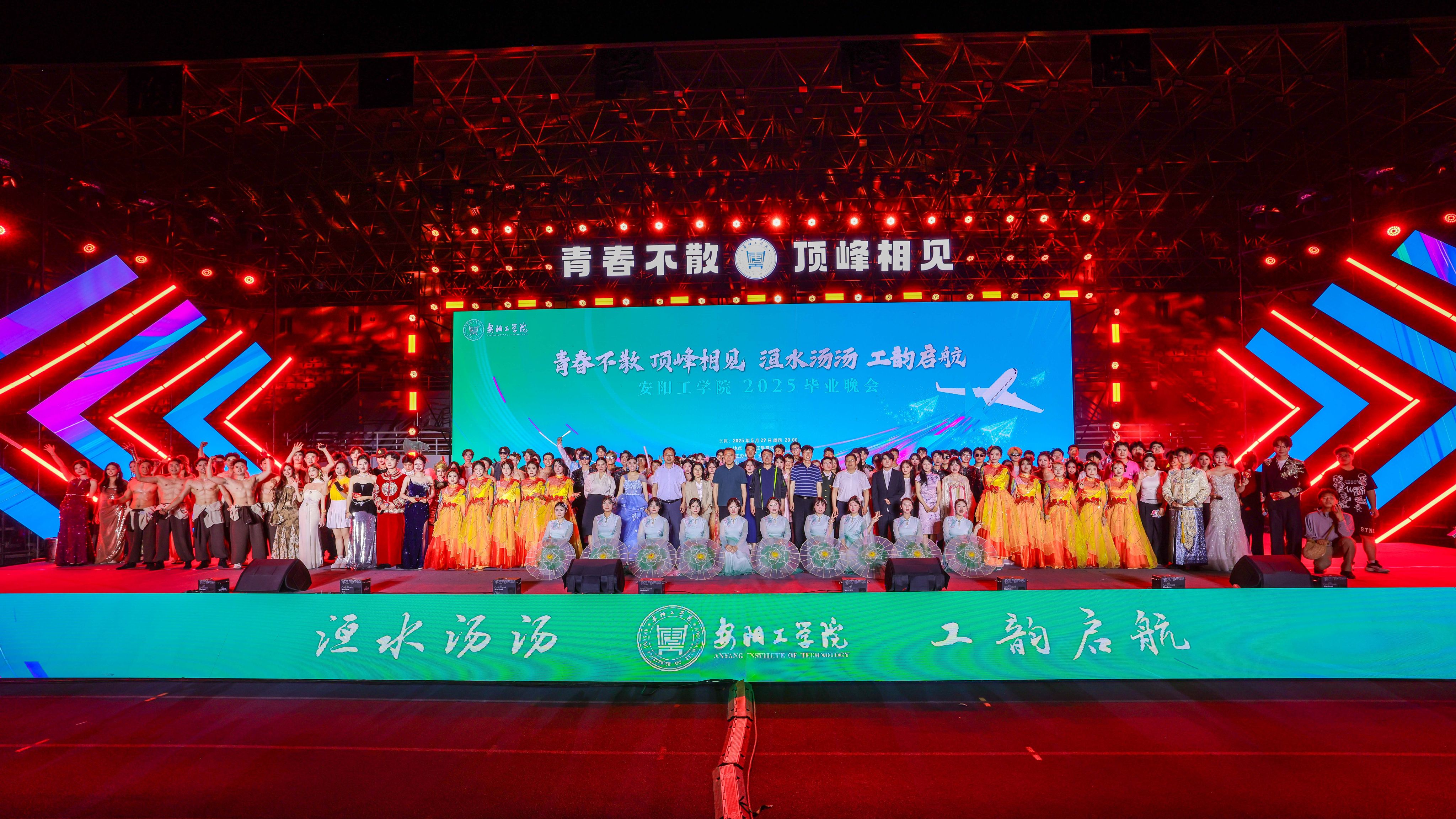 晚会在一段精彩的开场视频和电子电气与无人机学院的无人机秀中拉开帷幕,展现了我校航空与低空经济办学特色及同学们四年来在校园里的点点滴滴,勾起了大家对往昔岁月的深深怀念。晚会节目形式多样,精彩纷呈,舞蹈《大河之子》《灼·明月》《热烈一夏》《茉莉芬芳》、走秀《“型”走未来》以充满活力的舞步展现了大学生朝气蓬勃的精神风貌;歌曲《那些年》《乐来越好》《逃之夭夭》《希望的田野上》熟悉的旋律引发了全场大合唱;老师们精心准备创意融合秀《国之韵》成为一大亮点,平日里严谨治学的教师团队纷纷走上舞台,展现出别样风采;诗朗诵《你和我》表达了毕业生们对未来的憧憬和坚定信念,激励着大家勇敢地追逐梦想;小品《阿拉丁·路灯》以幽默诙谐的方式,再现了大学生活中的趣事和考研奋斗历程;话剧《刻骨铭心》展现了安阳作为学生第二故乡魅力,舞台剧《回溯安工》回溯了我校从建校到当下毕业生毕业的点点滴滴。晚会还特别设置了感恩环节。毕业生代表向辛勤培育的老师们献上了鲜花,表达了对老师们的深深敬意和感激之情。