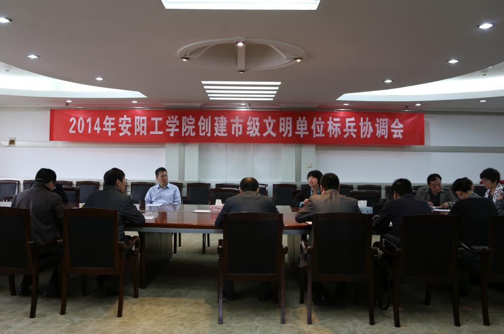 今天上午,我校2014年创建市级文明单位标兵协调会在行政楼三楼会议室召开。校党委副书记、工会主席杨培出席并讲话。党委办公室、党委组织部、宣传统战部、学生工作部、工会、团委、后勤管理处等各相关职能部门负责人及各学院党总支书记参加会议。协调会由宣传统战部部长赵晓晶主持。
