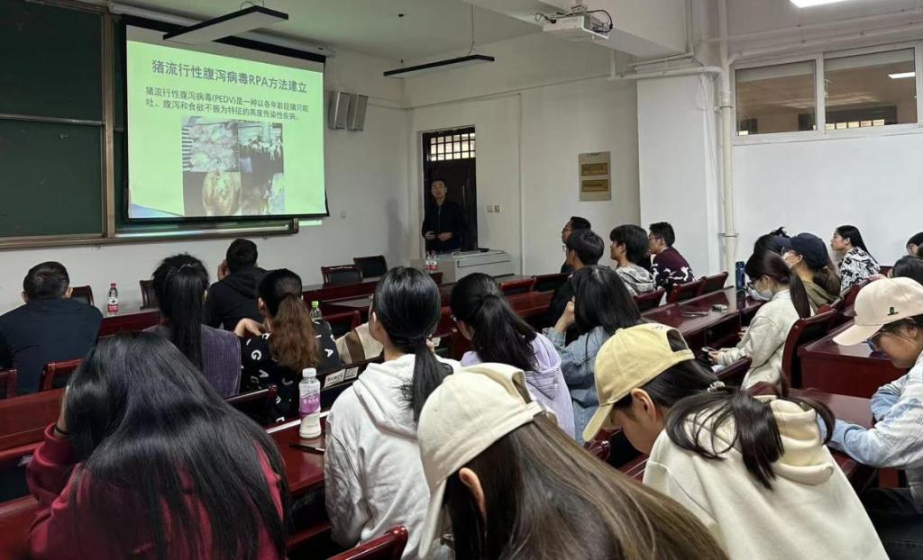 论坛中,崔月龙主任以《肿瘤与放射治疗》为主题作了报告,对肿瘤定义、良性恶性肿瘤区别及放射治疗在肿瘤疾病中的应用等进行了详细阐述。马磊博士以《重组酶聚合酶扩增方法在传染病检测中的应用》为题进行报告,详细讲解了重组酶聚合酶扩增方法的技术原理,分享了项目团队现阶段开展的猪的重要传染病病原检测的相关研究进展。在报告结束后的自由讨论环节,与会师生踊跃发言提问,两位老师结合相关案例一一详细解答,现场气氛热烈,形成了良好的学术交流氛围。