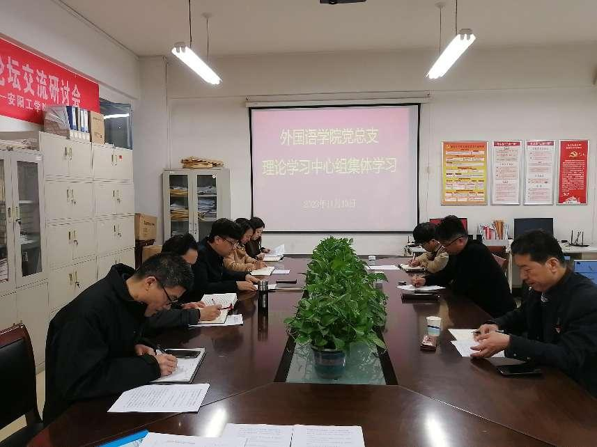 11月10日上午,外国语学院党总支理论学习中心组全体成员在A10-201会议室召开学习研讨会,党总支书记王孟主持会议。校理论学习第一巡听旁听指导组组长赵驰欣、副组长许华珂、郭新志全程参与并作具体指导。