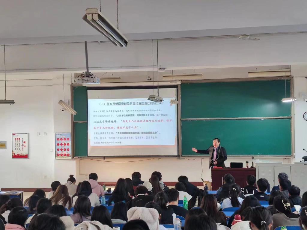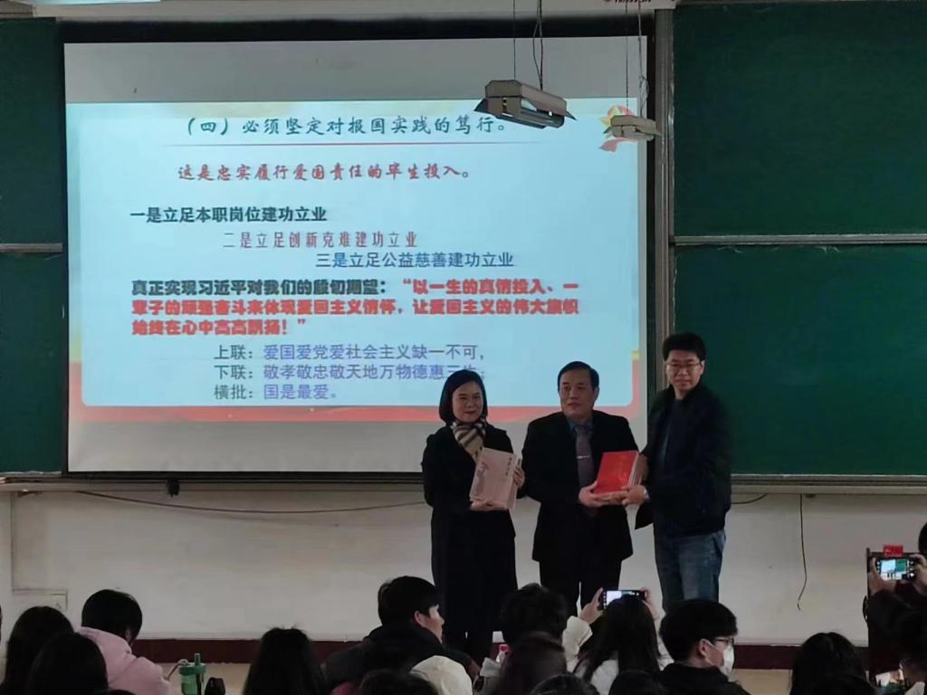 孙魁老师从学习贯彻习近平新时代中国特色社会主义思想要突出对其爱国主义论述的深刻理解、新时代新征程切实履行好爱国责任是每一名当代中国大学生的神圣义务和庄严使命、当代青年大学生一定要在深学笃行习近平新时代中国特色社会主义思想中担负起爱国重任三个方面,为大家带来一场生动精彩的思政课,并获得同学们连连掌声。授课过程中,孙魁老师还围绕自己的代表作《母爱伴我行》,从母爱引我走上爱国路、珍重爱国情、树立报国志等六个方面分享了自己的亲身感受,深深地感动了在场的老师和学生,课堂上时不时爆发出热烈掌声。