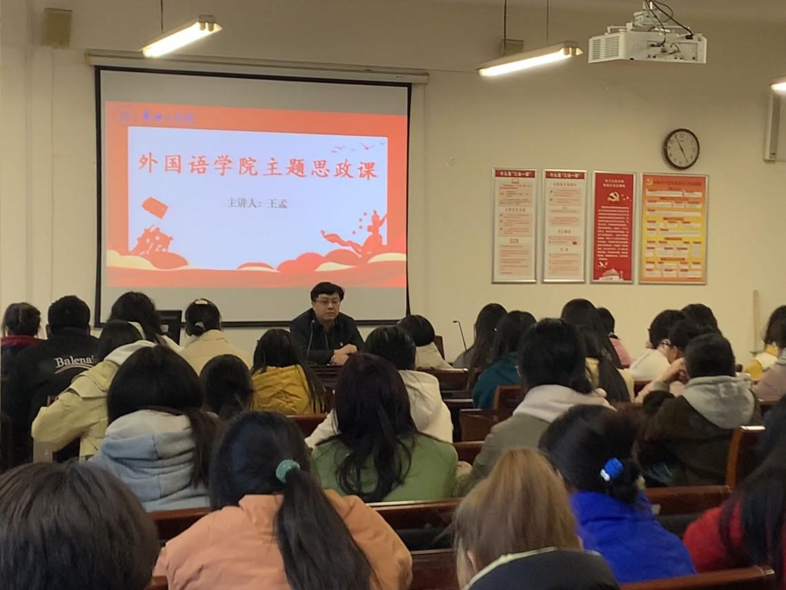 近日,外国语学院党总支书记王孟以“深学细悟习近平文化思想,努力成为具有中国气质的外语人才”为题,为外国语学院师生代表上思政课。
