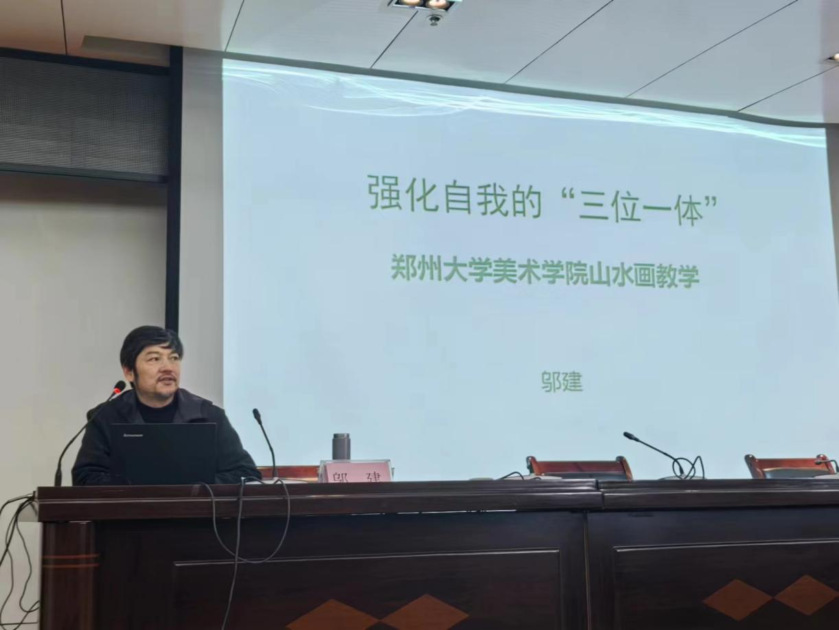 1月5日,应我校艺术设计学院邀请,郑州大学美术学院邬建教授到我校参加郑州大学美术学院山水画工作室与ag九游会登陆j9入口中国画教研室师生作品交流展,并为我校师生作《中国画学习漫谈》的学术讲座。