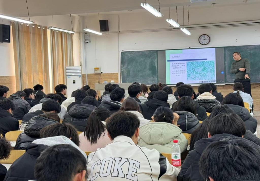 本次讲座特邀我市人民医院呼吸内科、感染性疾病科主任医师于磊为我校学生讲解传染病防治知识。首先,于磊针对身体不同部位可能出现的疾病进行分析,接着向同学们讲解各类传染病的危害,随后现场演示如何预防。最后,于磊提醒同学们要养成“洗净手,喝开水,吃熟食,勤通风,晒衣被”的良好卫生习惯。