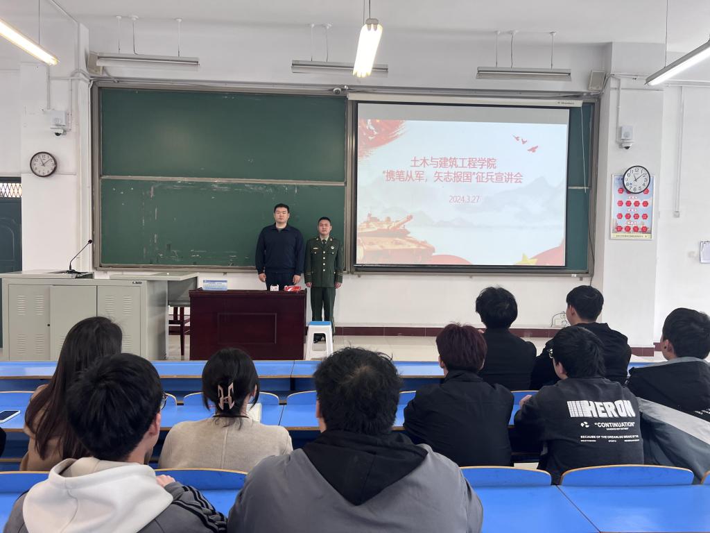 为落实我校征兵工作相关部署,鼓励学生积极参军入伍,土木与建筑工程学院于3月27日在A19-201教室召开“携笔从军 矢志报国”征兵宣讲会。学院党总支副书记李丹、毕业班辅导员及学生代表参加宣讲会。