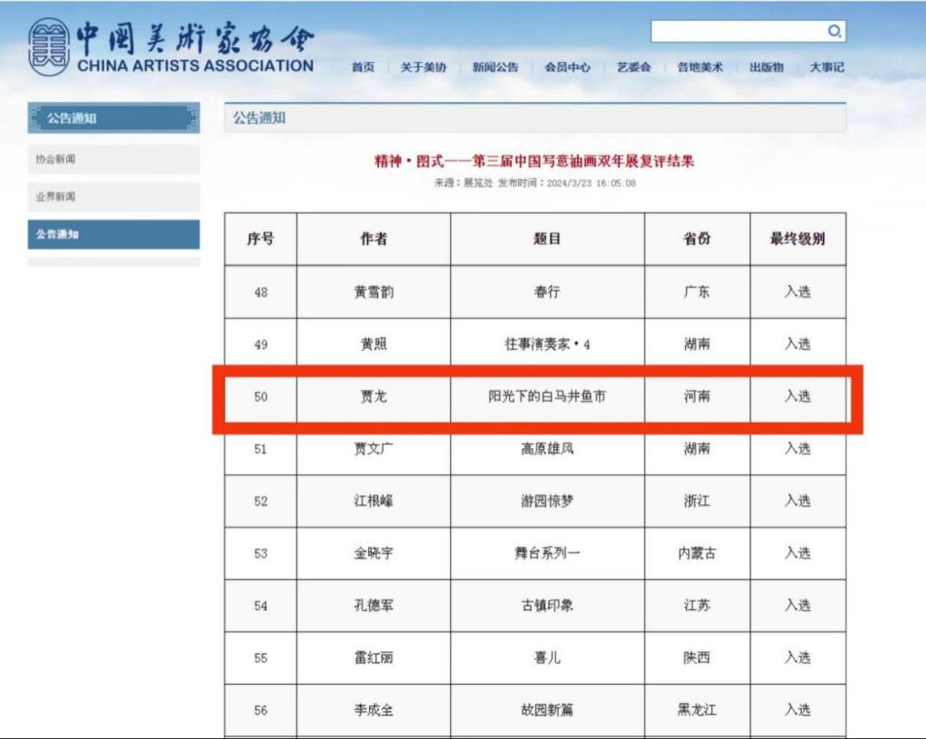 近日,中国美协公布第三届中国写意油画双年展复评结果,我校艺术设计学院教师贾龙创作的油画作品《阳光下的白马井鱼市》成功入选“精神·图式——第三届中国写意油画双年展”。该展览是由中国美术家协会、北京当代中国写意油画研究院、吉林艺术学院共同主办的全国性大展。经展览组委会初评、复评,最终评出入选作品200件。
