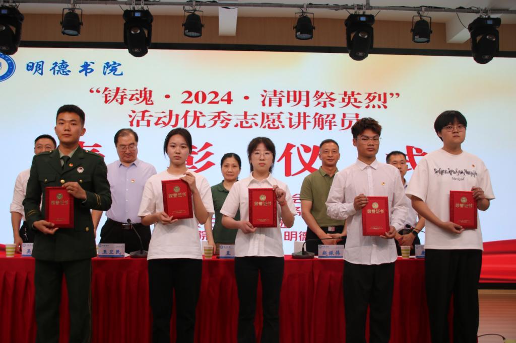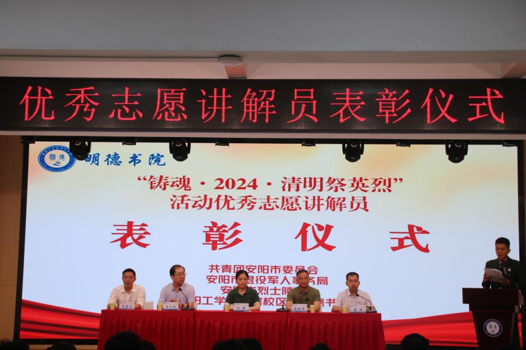 5月9日上午,明德书院在学术报告厅举行“铸魂·2024·清明祭英烈”活动优秀志愿讲解员表彰仪式,共青团安阳市委员会四级调研员王黎,安阳市退役军人事务局党组成员、副局长赵振伟,安阳市烈士陵园党支部书记、主任吴青山,洹滨校区、明德书院党总支书记王卫民,院长康博,党总支副书记赵浩婕出席表彰仪式,明德书院70余名学生参加表彰仪式。仪式由康博主持。