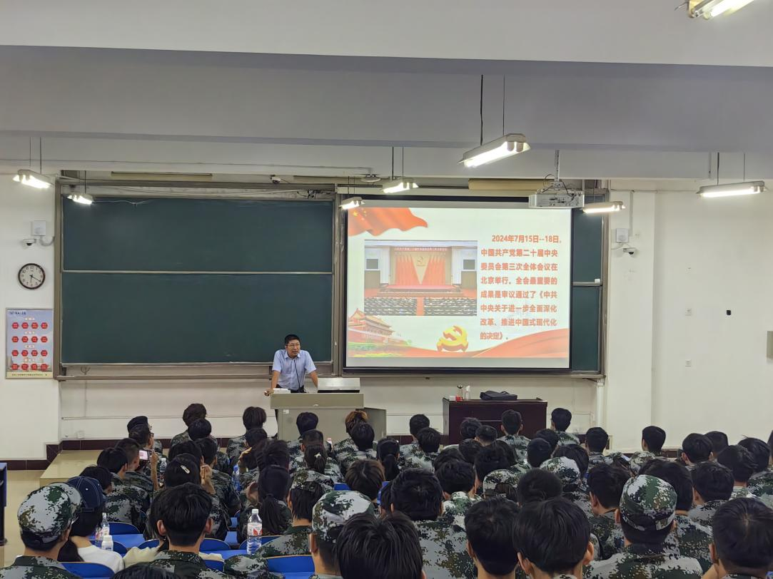 9月13日,党总支书记王伟在A17-204教室以《深入学习贯彻党的二十届三中全会精神 努力成为具备国际视野的时代新人 奋力书写为中国式现代化挺膺担当的青春篇章》为题,为2024级全体新生讲授开学第一课。王伟带领大家深刻领悟党的二十届三中全会的重大意义,鼓励同学们充分利用中外合作办学的独特优势,坚定文化自信,讲好中国故事、传播好中国声音,努力成长为具有国际视野、家国情怀、责任担当的时代新人。