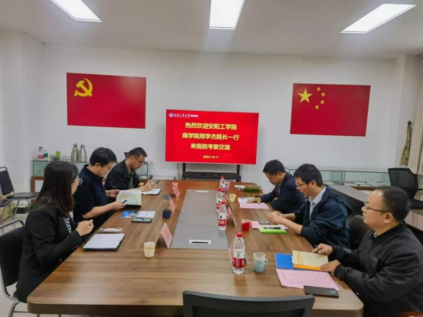 10月17日,商学院院长邢学杰一行4人赴河南工业大学考察学习,分别到管理学院、经贸学院进行座谈交流。座谈会上,双方就师资队伍、学科建设与专业发展、实验室管理、科学研究、社会服务等方面充分讨论并交换了意见,为学院发展提供了新的发展思路。双方表示将继续加强交流与合作,为培养高素质人才贡献力量。