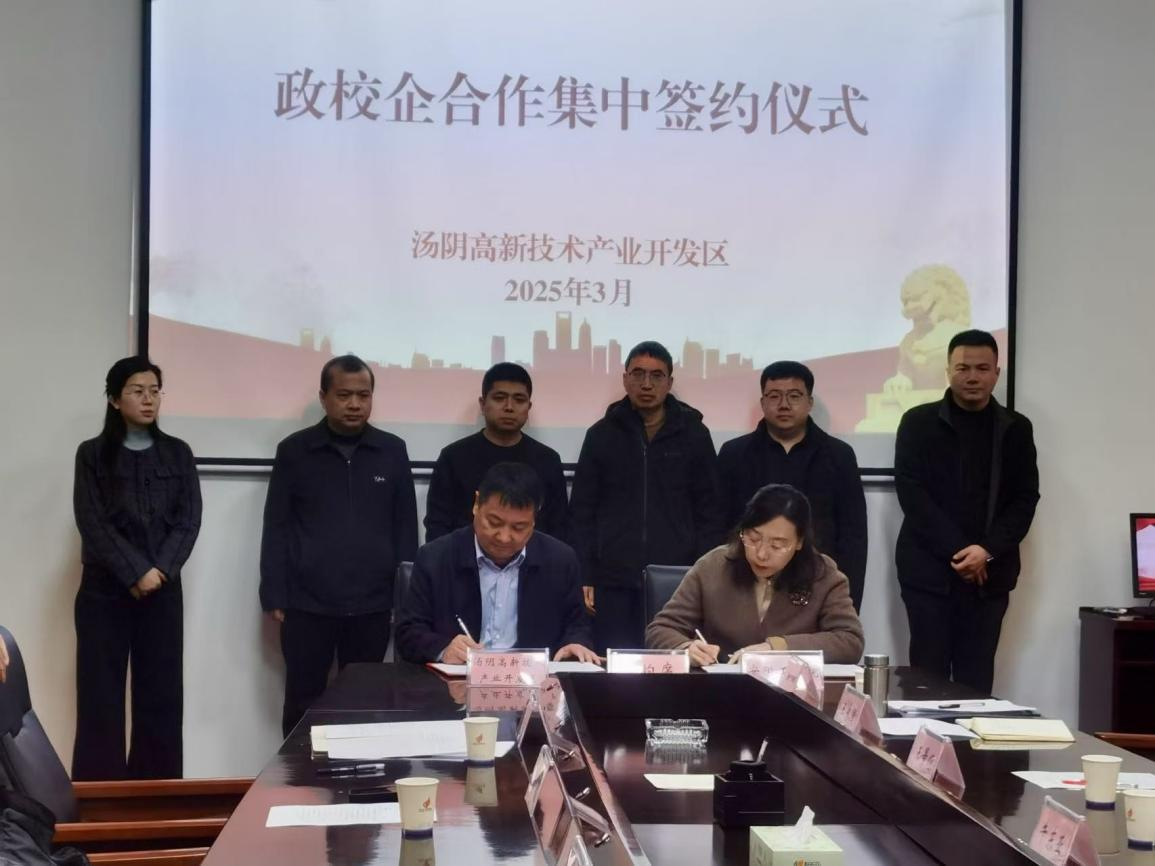 校企合作签约仪式在汤阴县开发区管委会一楼企业之家举行。开发区党工委副书记、纪工委书记蔡向阳致辞,详细介绍了开发区的产业发展现状及未来规划,强调了政校企合作对于推动地方经济发展和人才培养的重要性。牛东亚在发言中介绍了我校的学科特色、人才培养成果以及在产学研合作方面的探索与实践,表示将充分发挥学校的人才和科研优势,积极与开发区企业开展合作,为地方经济发展贡献力量。