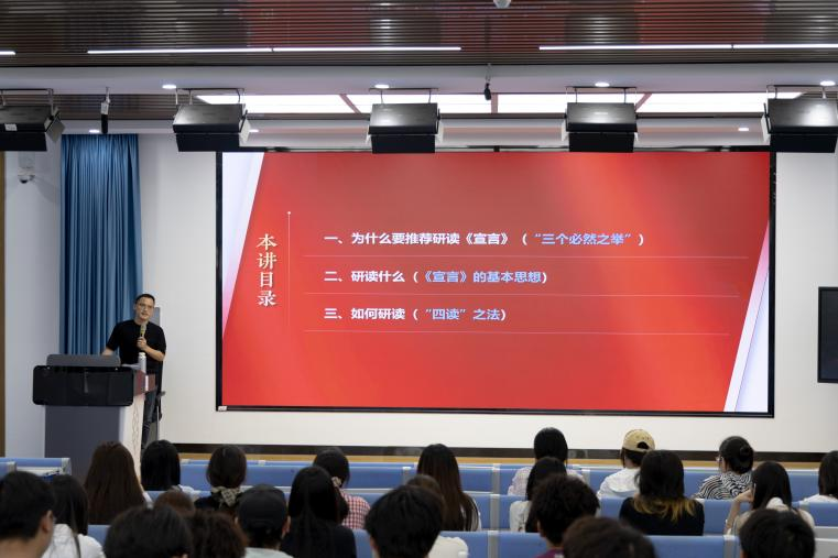 读书分享会由图书馆直属党支部副书记凌红蕾主持。马克思主义学院教师邢继伟从多视角解读了《共产党宣言》,分享了研读《共产党宣言》四读之法。读书分享会鼓励大家在阅读中汲取智慧,在分享中启迪思想,让经典力量融入日常的学习和生活,对于促进师生思想交流、提升校园文化内涵起到了积极作用。