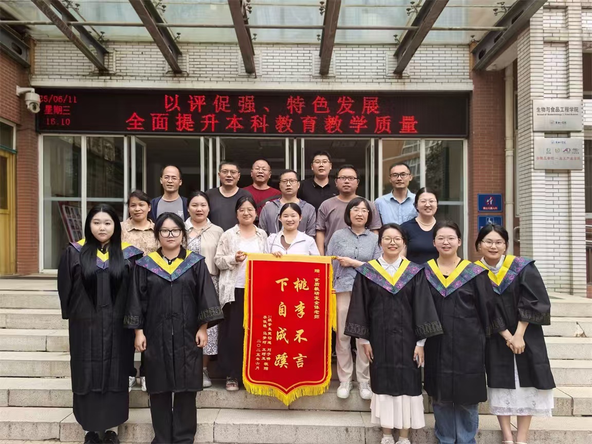 6月11日,生物与食品工程学院21级毕业生代表向食品质量与安全教研室全体教师赠送锦旗。“桃李不言 下自成蹊”,短短八字,源于对老师们育人的感谢,也是对自己在治学道路上的鼓励。