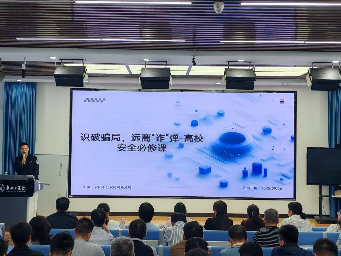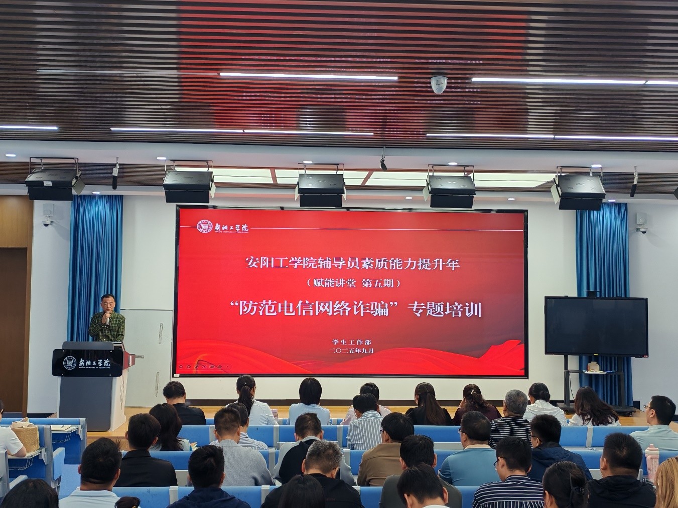 9月26日,学校第五期辅导员赋能讲堂在A02-202举行。高新分局刑侦大队张天地到场作专题培训,各学院党委副书记、全校辅导员参加。学生工作部部长王振宇主持。
